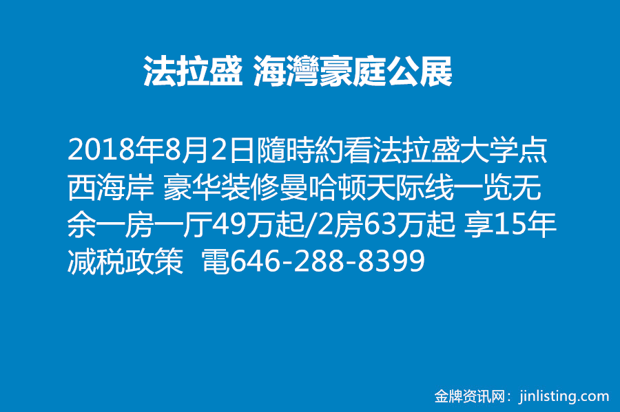 時間:隨時約看 地址:法拉盛大學點西海岸 两栋海景大厦134个单位,多车位及船位。豪华装修,配私人游艇俱乐部,曼哈顿天际线一览无余。一房一厅49万起,2房63万起。享15年减税政策,8月订房九折优惠,可贷款75% 電話:646-288-8399