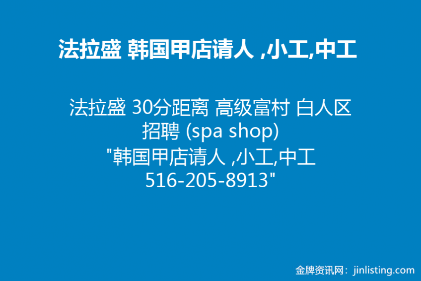 法拉盛 30分距离 高级富村 白人区 招聘 (spa shop) “韩国甲店请人 ,小工,中工 516-205-8913”