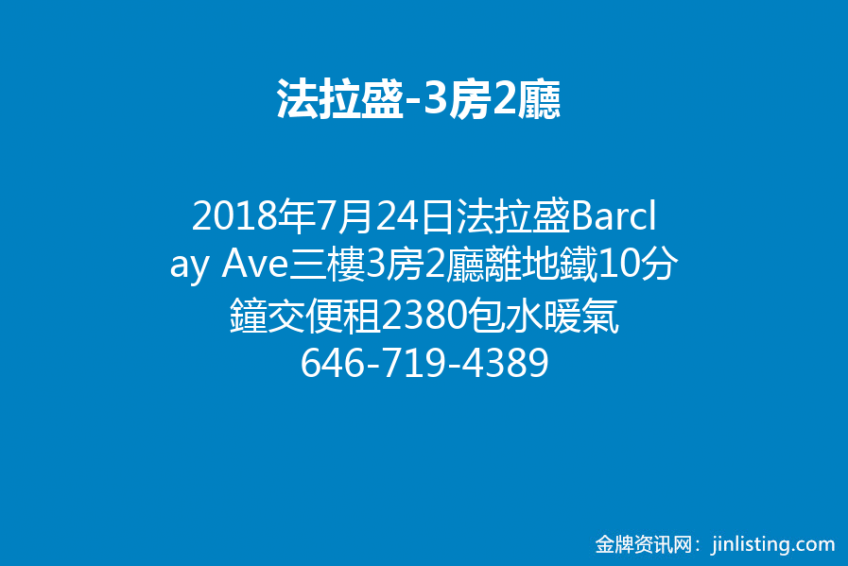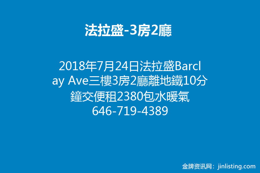 法拉盛Barclay Ave三樓3房2廳離地鐵10分鐘交便租2380包水暖氣 646-719-4389
