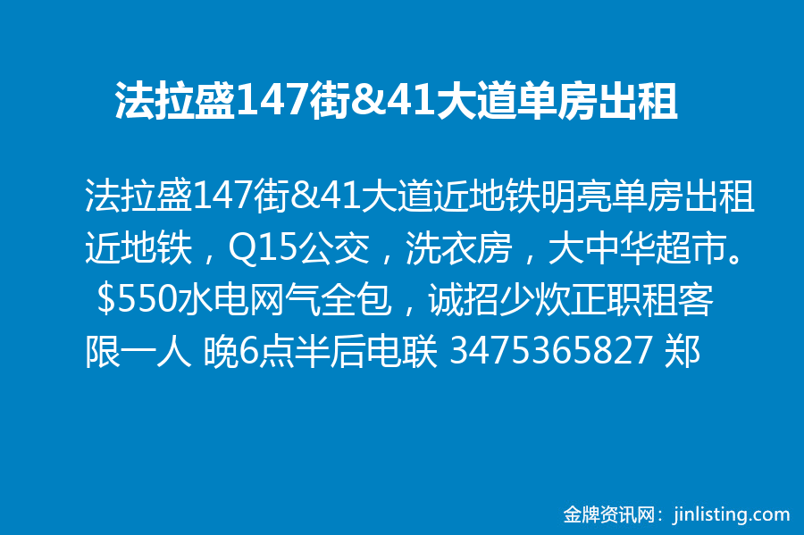 法拉盛147街&41大道近地铁明亮单房出租,近地铁,Q15公交,洗衣房,大中华超市。