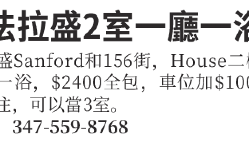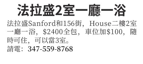 法拉盛2室一厅一浴$2400全包 车位加100,
