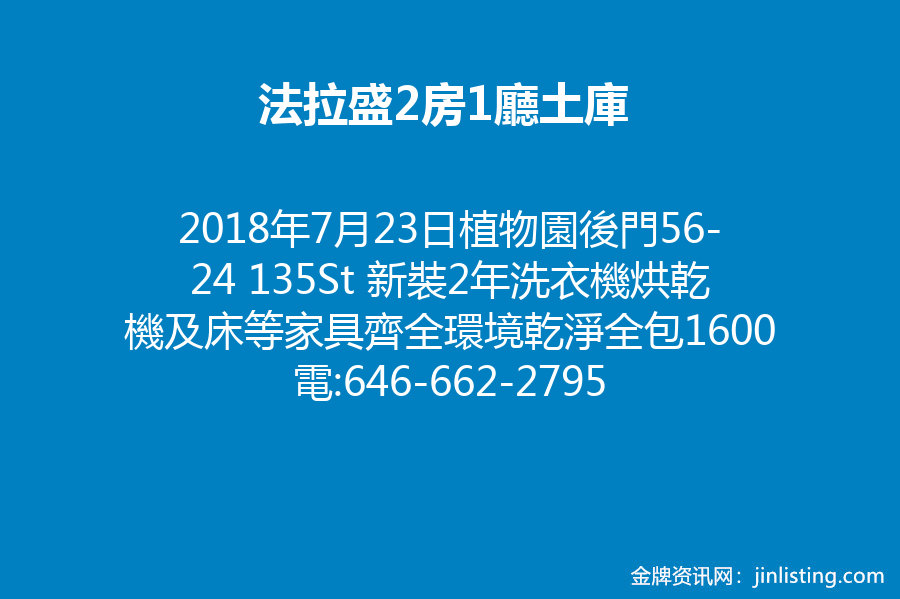 2房1廳土庫 植物園後門56-24 135St 新裝2年洗衣機烘乾機及床等家具齊全環境乾淨全包1600電:646-662-2795