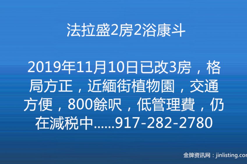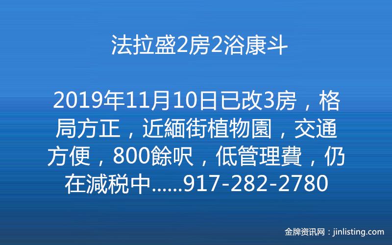 法拉盛2房2浴康斗,已改3房,格局方正,近緬街植物園,交通方便,800餘呎,低管理費,仍在減税中,投資自住皆宜,僅售65萬,更多詳情及房源請洽917-282-2780