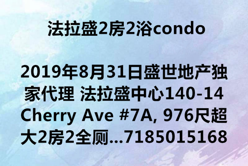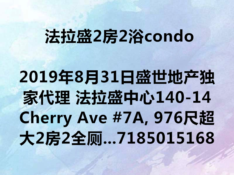 法拉盛2房2浴condo “盛世地产独家代理 法拉盛中心140-14 Cherry Ave #7A, 976尺超大2房2全厕加大型阳台漂亮电梯康斗,管理费$475/月,除电全包。格局好,四面通风,采光好。十分钟地铁站,近超市,餐馆,适自住或投资。有钥匙随时看! 预约微信/电话:7185015168 刘先生”