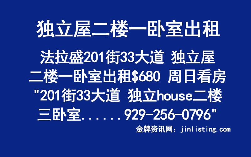 法拉盛201街33大道 独立屋二楼一卧室出租$680 周日看房929-256-0796