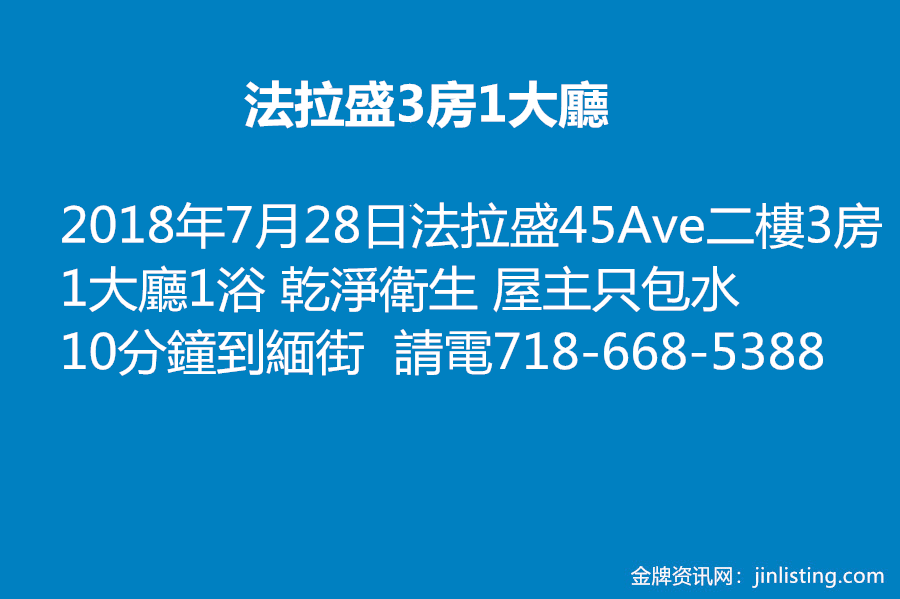 法拉盛163街45Ave二樓3房1大廳1浴室乾淨衛生,屋主只包水,交通方便乘車Q27/65/26,10分鐘到緬街請電718-668-5388