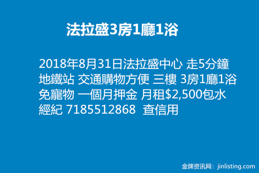 法拉盛中心,走5分鐘地鐵站, 交通購物方便,三樓 3房1廳1浴,免寵物, 一個月押金,月租$2,500 包水, 查信用 經紀 郭小姐 718-551-2868