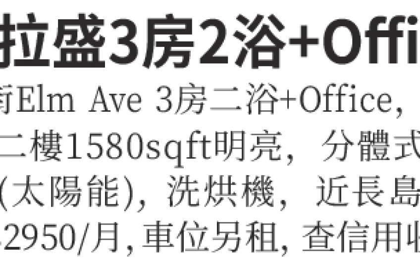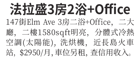 法拉盛147街&Elm Ave 3房2浴+Office,有两个大厅,