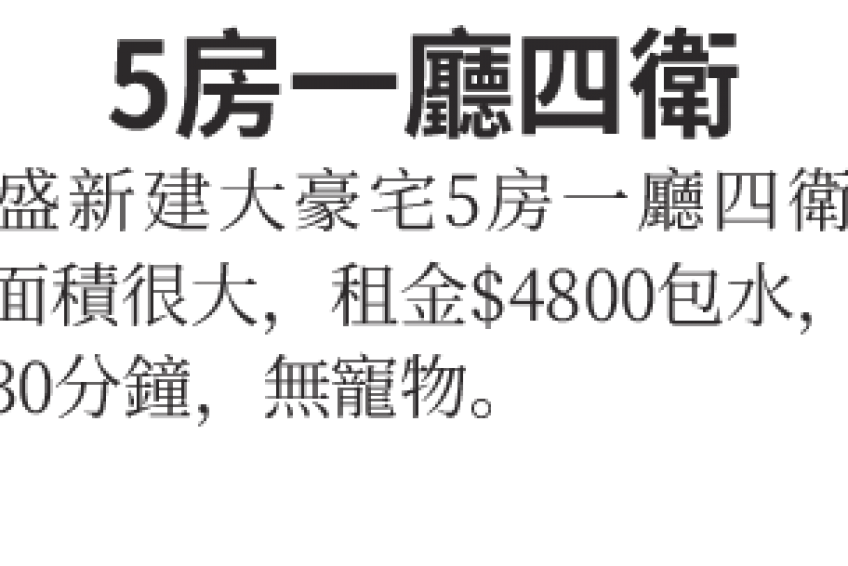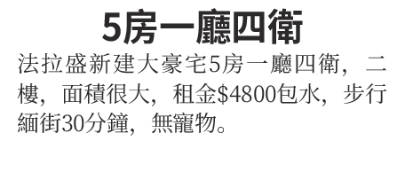面积很大 租金$4800包水二楼 无宠物 详询请电 9293004947