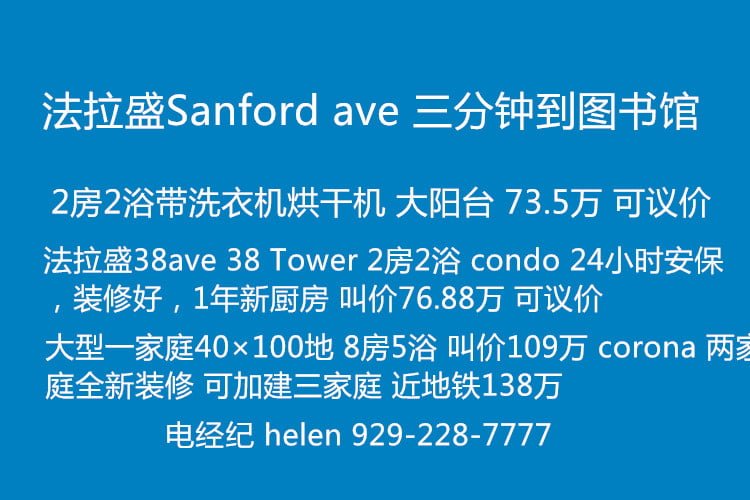 法拉盛Sanford ave 三分钟到图书馆 2房2浴带洗衣机烘干机 大阳台 73.5万 可议价 法拉盛38ave 38 Tower 2房2浴 condo 24小时安保,装修好,1年新厨房 叫价76.88万 可议价 法拉盛中心 大型一家庭40×100地 8房5浴 叫价109万 corona 两家庭全新装修 可加建三家庭 近地铁138万 电经纪 helen 929-228-7777