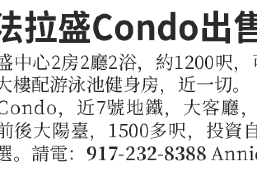 另大Condo,近7號地铁,大客廳,3房3浴,前後大陽台,1500多尺,投資自住最佳首選。