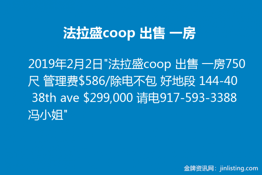 “法拉盛coop 出售 一房750尺 管理费$586/除电不包 好地段 144-40 38th ave $299,000 请电917-593-3388 冯小姐”