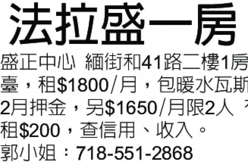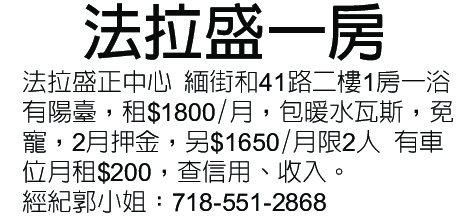 法拉盛正中心 緬街和41路 2樓 1房1浴 有陽臺, 租$1800/月,包暖水瓦斯,免寵,2月押金,另$1650/月限2人 有車位月租200 查信用 收入