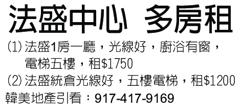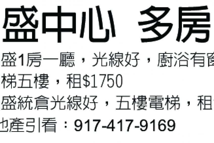 (1)發盛1房1廳,光線好,廚浴有窗,電梯5樓租$1750