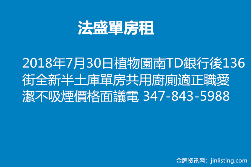 植物園南TD銀行後136街全新半土庫單房共用廚廁適正職愛潔不吸煙價格面議電 347-843-5988