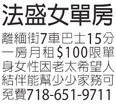 離緬街7車巴士15分一房租限単身女性月租$100因老太希望人結伴如能幫少少家務可免費電718-651-9711