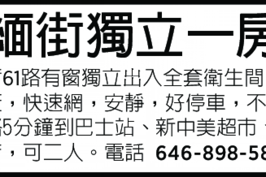 法盛緬街61路快速網路也可二人住有窗獨立岀入衛生間全套 大衣栕 清潔安靜整齊 好停車 不掃街 走路5分鐘到巴士車站新中美超市洗衣店電646-898-5876