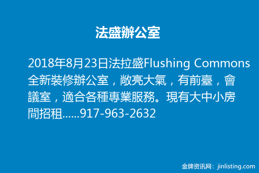 法拉盛Flushing Commons全新裝修辦公室,敞亮大氣,有前臺,會議室,適合各種專業服務。現有大中小房間招租,租金$500-4000不等。917-963-2632