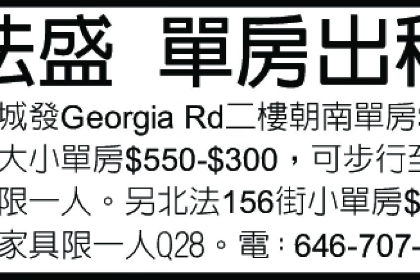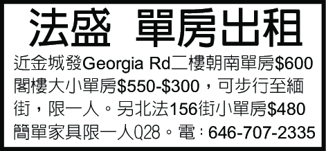 近金城發GeorgiaRd二樓朝南單房$600,閣樓大小單房$550$300,可步行至緬街限一人。另北法156街小單房$480,簡單家具限一人Q28