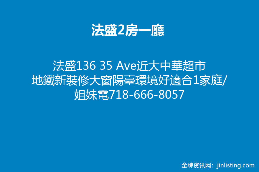 法盛136 35 Ave近大中華超市地鐵新裝修大窗陽臺環境好適合1家庭/姐妹電718-666-8057