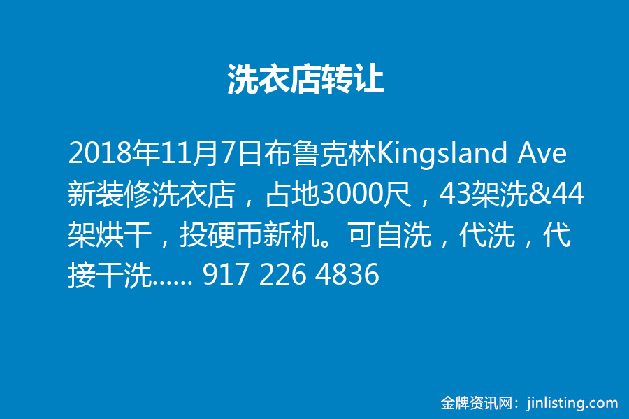 洗衣店转让 布鲁克林Kingsland Ave新装修洗衣店,占地3000尺,43架洗&44架烘干,投硬币新机。可自洗,代洗,代接干洗。因東住有多家洗衣店,无暇兼顾,所以转让。如果想转行做洗衣店是个不错的选择,因为投资低,可贷款,回本稳,赔率小。有意者请电聊 917 226 4836,非诚勿扰!
