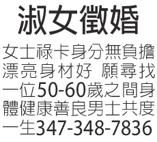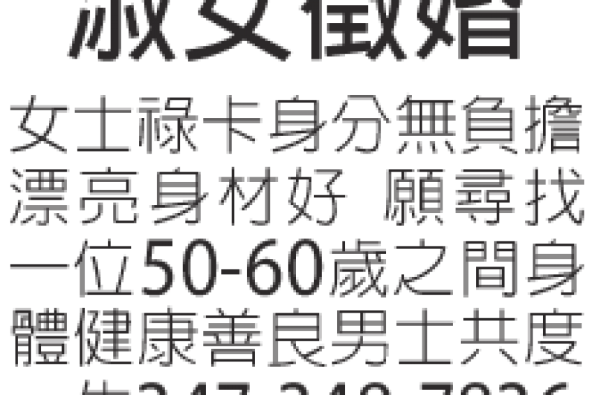 女士 祿卡身份 無負擔 漂亮 身材好 願尋找一位50-60歲之間 身體健康 善良的男士 共度一生 非誠勿擾 電:347-348-7836
