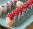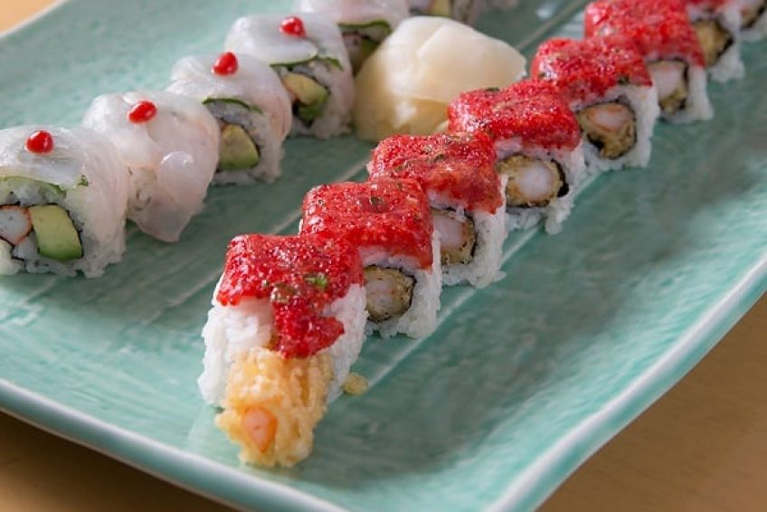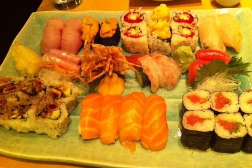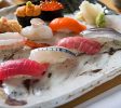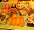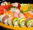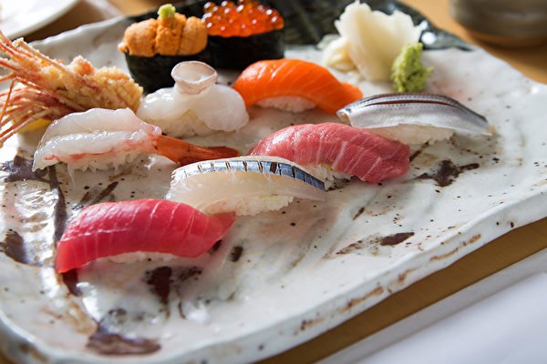 寿司永远透着日本料理的精神:精致而美丽,极像艺术品一整盘的握寿司,上面可附奶黄的蛋卷,焦棕色的鳗鱼,外紫内白的章鱼肉,还有文理细腻,粉白相间的带尾虾身。各类海味可以是半透明,艳丽的深红色,浅粉色,还有银光闪闪的带皮鱼身。旁缀一抹绿色的芥末和小团甜姜片。