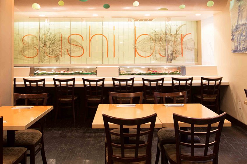 走进整洁的清水寿司酒吧,两条醒目的大鱼静止在墙上,眼睛好似看着坐下来的客人。微笑的日本女侍者递上擦手热毛巾,在寿司台前坐定之后,厨师清水先生开始忙碌。他以熟练的手势从锅中取出早已准备好的醋饭后,双手并用,灵活的手指捻一捻,压一压,把醋饭捏成小椭圆形,看似随意,但是极其精准,他在小团醋饭上包上一片片火烤,酱浸过的块状鳗鱼,中间再绑上一条海苔。