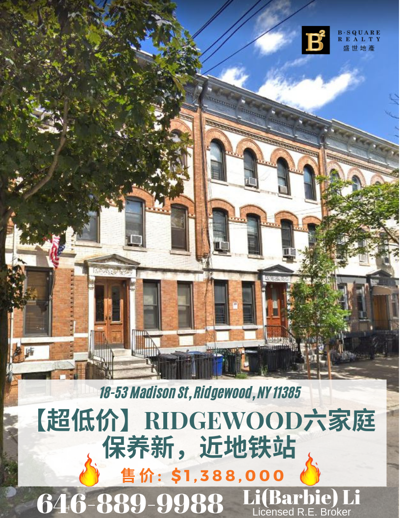 超低价Ridgewood黄金地段六家庭,房27.5’ X 68’,地面三层,每家庭3卧1卫。保养佳,7年新锅炉,好管理。三分钟步行地铁站,地铁25分钟直达曼哈顿。旁边一条街是Myrtle Ave,餐馆超市商店银行应有尽有,生活便利。仅售$138万8 (as is, with tenants)