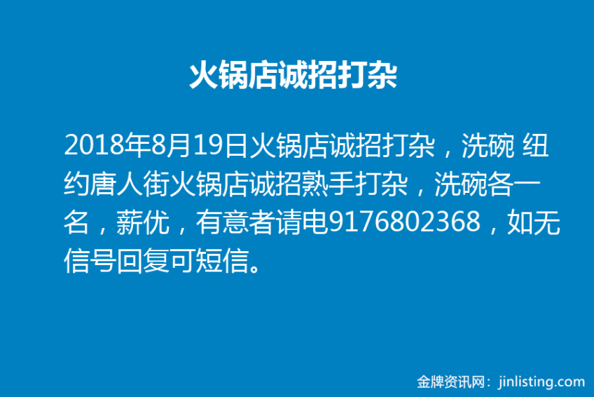 火锅店诚招打杂,洗碗 纽约唐人街火锅店诚招熟手打杂,洗碗各一名,薪优,有意者请电9176802368,如无信号回复可短信。