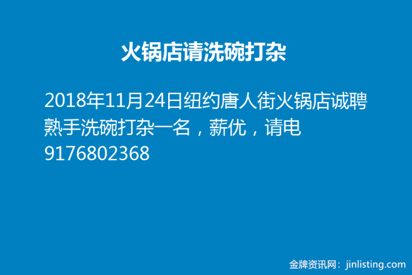 火锅店请洗碗打杂 纽约唐人街火锅店诚聘熟手洗碗打杂一名,薪优,请电9176802368