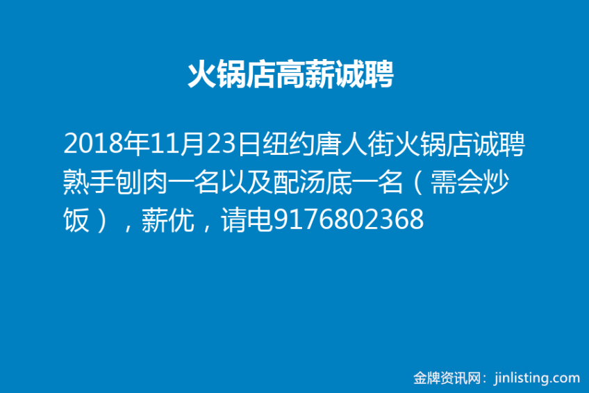 火锅店高薪诚聘 纽约唐人街火锅店诚聘熟手刨肉一名以及配汤底一名(需会炒饭),薪优,请电9176802368