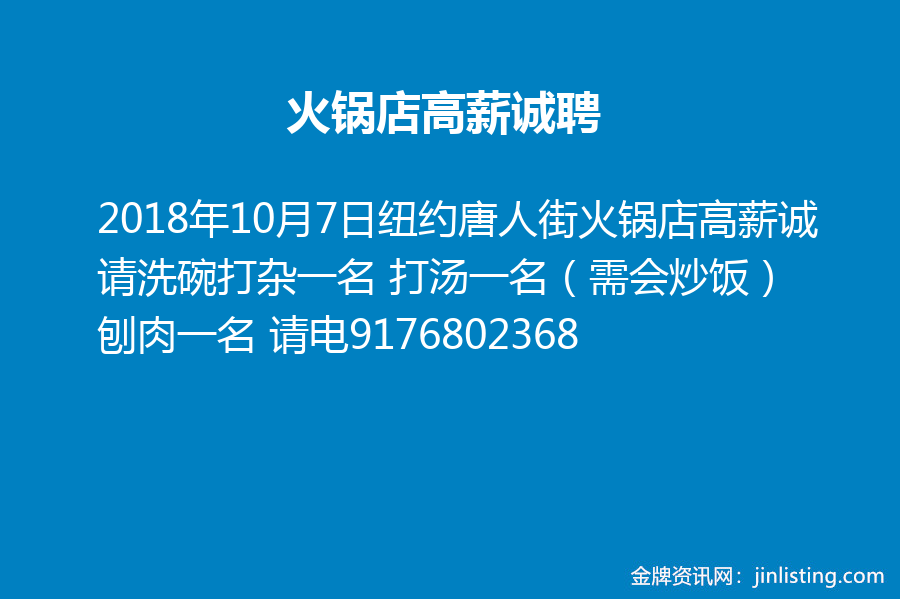 火锅店高薪诚聘 纽约唐人街火锅店高薪诚请洗碗打杂一名 打汤一名(需会炒饭)刨肉一名 请电9176802368