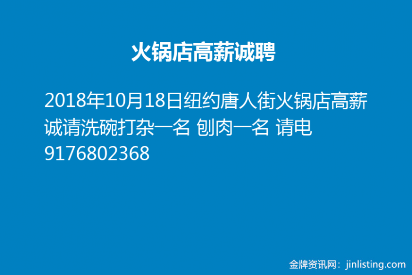 火锅店高薪诚聘 纽约唐人街火锅店高薪诚请洗碗打杂一名 刨肉一名 请电9176802368