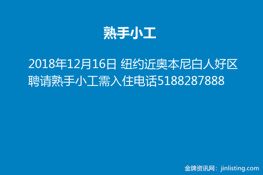 熟手小工 纽约近奥本尼白人好区聘请熟手小工需入住电话5188287888