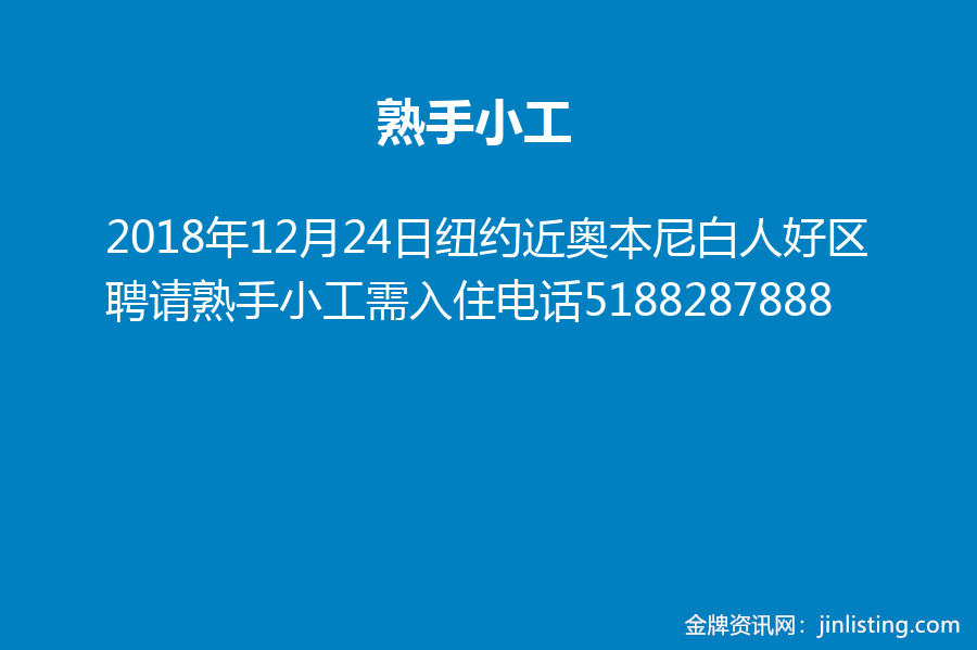 熟手小工 纽约近奥本尼白人好区聘请熟手小工需入住电话5188287888