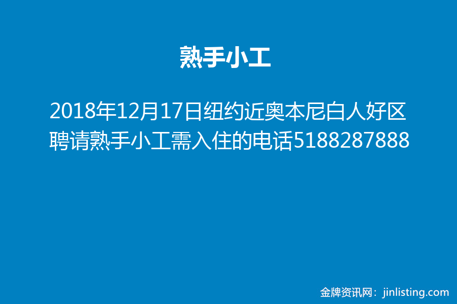 熟手小工 纽约近奥本尼白人好区聘请熟手小工需入住的电话5188287888