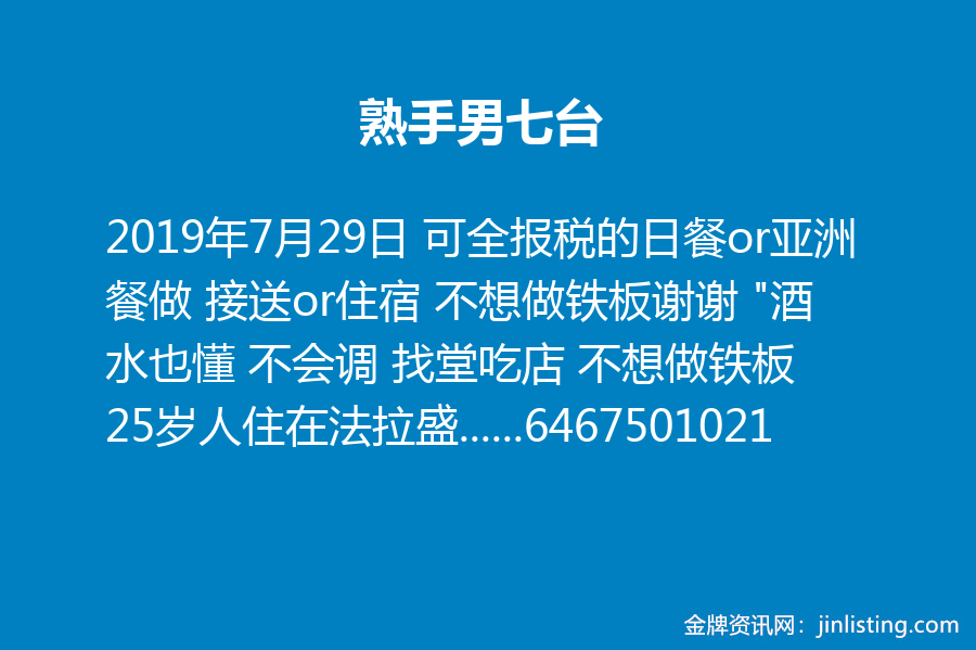 熟手男七台可全报税的日餐or亚洲餐做 接送or住宿 不想做铁板谢谢 “酒水也懂 不会调 找堂吃店 不想做铁板 25岁 人住在法拉盛 谢谢 电话是6467501021 外周远点也行 但希望 住宿什么的好一点”