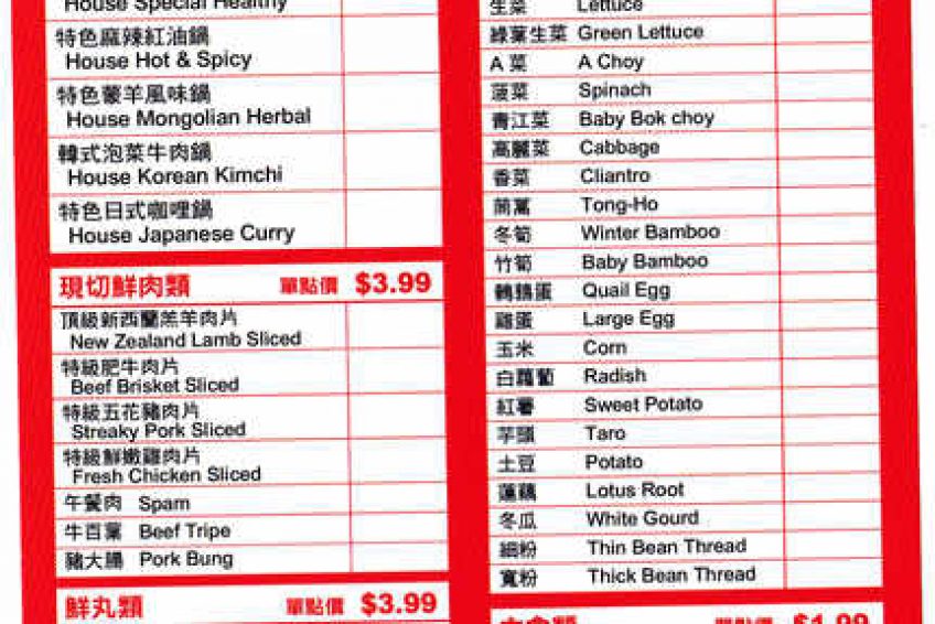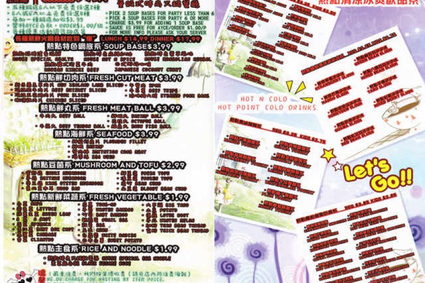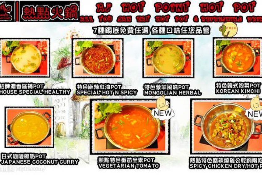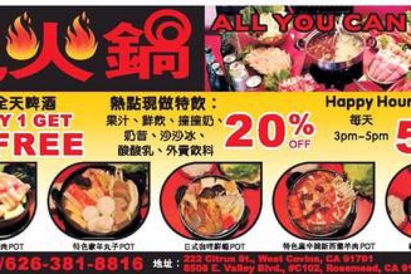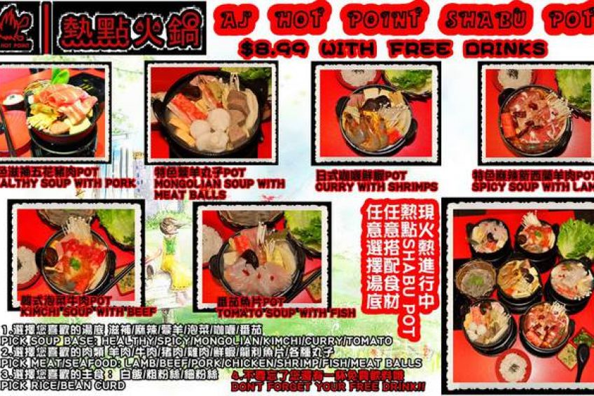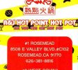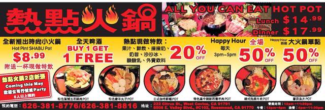 熱點火鍋位於Rosemead中心地區的New Valley Plaza(新萬利廣場),是一家All-You-Can-Eat(不限量)的新派火鍋餐廳。第一次走進熱點,您會以為它的最大特點是環境,因為這裡的裝修實在是漂亮丶精緻,蕩漾著青春文藝範兒。但是火鍋湯底和各類菜肉一盤盤端上桌的時候,您就發現,熱點不光是面子令人驚艷,裡子上更是下足功夫丶一絲不苟。牛羊肉的新鮮程度和肉質可以用“傲視同群”來形容。五種特色鍋底各有千秋,滋補丶辣爽丶蒙羊丶泡菜丶咖哩,每種都是精心調配,令人一嚐難忘。魚丸丶蝦丸丶海鮮丶蔬菜丶菌類一應俱全,樣樣都特別新鮮。至於這裡的服務麽,聽聽去吃過的朋友在Facebook上是怎麽評價的:- “服務好到自己都快變公主了!!!”- “態度超好!可愛的老闆不斷跑來問要不要再加東西!”- “They are so hard-working!”要了解熱點,您就得認識一下它的主人——兩位剛剛本科畢業不久的超可愛mm, A和J。她們有著年輕人獨有的張揚個性和創業激情,對菜品的新鮮高質丶服務的熱情周到有著近乎苛刻的追求,並在餐廳環境上獨具匠心,親手設計和佈置了整個火鍋店的所有內飾。看著她們和店員一起在桌台之間穿梭忙碌,您能真切感受到那種全心全意的投入和快樂。這可能也就是熱點和很多其他餐館最大的不同吧。 Menu簡介:All You Can Eat火鍋大餐,午餐每位$13.99,晚餐每位$16.99,不限量,任您吃到爆!五種特色鍋底,免費任選:- 熱點特色滋補鍋- 熱點麻辣紅油鍋- 熱點蒙羊風味鍋- 熱點韓式泡菜鍋- 熱點日式咖哩鍋特色自製飲料免費暢飲。菜品(舉例):- 肉類: 頂級羊羔肉,特級肥牛肉,特級五花肉- 鮮丸類:牛肉丸,牛筋丸,鮮蝦丸,鱈魚丸- 海鮮類:鮮魚片,鮮蝦,蟹肉棒- 其他類:各類菌類,蔬菜,血豆腐,牛百葉,午餐肉等- 飲料: 冬瓜涼茶,酸梅汁等營業時間: SUN-THU 12PM 至11PM FRI-SAT 12PM 至1AM