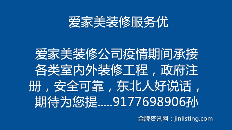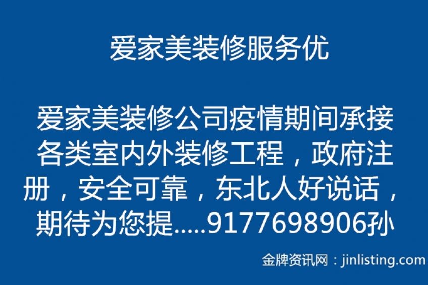 爱家美装修服务优 爱家美装修公司疫情期间承接各类室内外装修工程,政府注册,安全可靠,东北人好说话,期待为您提供服务!联系电话:9177698906孙
