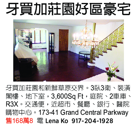 牙買加莊園和新鮮草原交界。3臥3衛、裝潢閣樓、地下室,3,600Sq Ft,庭院、2車庫、R3X。交通便,近超市、餐廳、銀行、醫院、購物中心。售$168萬8。173-41 Grand Central Parkway。Lena Ko,917-2041928