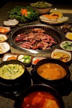 韓國烤肉以其味道香淳獨特,肉質鮮嫩可口,廣受華人老饕的喜愛,這樣的餐館在韓國城到處都是,但是韓國人都認為「牛國」是韓國社區最高級及最好吃的烤肉店。在很多華人的期盼下,牛國韓國烤肉店在華人社區的ROSEMEAD大道上開分店了。今後,想吃高級又好吃的韓國烤肉,不必跑到韓國城了。 「牛國」在開幕期間推出兩個酬賓計劃,首先是3人以上一起吃午餐,就會送韓國最高級紅酒一瓶,另外,週日至週四晚上9點至12點,酒品類一律半價。  現代人吃飯,不光講究菜色要好,還要吃的愉快丶健康,所以服務及裝潢就特別重要了。 「牛國」設備新穎,抽風機採底抽式,功能很強,享受烤肉卻完全感受不到會熏得滿頭滿身怪味的油煙,是家庭丶親友丶情侶丶公司聚餐的好地方,更是招待朋友及洽商的首選。 「牛國」是任你吃到飽的韓國烤肉店,用料高級丶新鮮,每天有29種肉類丶海鮮及蔬菜任你點選,另外,還有豐盛熟食吧,午餐每人$19.99丶晚餐每人$24.99,3至10歲孩童每人$12.99。  餐廳裡的牛肉全部都是美國本地的安格氏牛肉及神戶牛肉,肉質肥瘦均勻,紅色的精肉與白色的脂肪比例勻稱,香而不膩,烤起來口感外香內嫩,肉汁很多。如安格氏牛雪花肉片丶韓式牛肋排丶生鮮牛肋排丶牛排丶牛舌丶各式牛