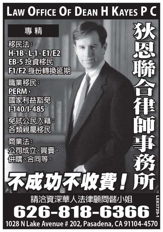 狄恩聯合律師事物所專精移民及商業法。在職業移民丶傳統親屬移民以及投資移民方面有20年經驗。事務所首席律師DEAN KAYES先生是加州註冊律師,專精於移民和商業法。曾參與多家跨國公司的並購業務以及處理過上千個移民案件。 公司有多名熟悉國粵臺語的法律顧問和助理。為您提供最有保障丶價格最優的法律服務