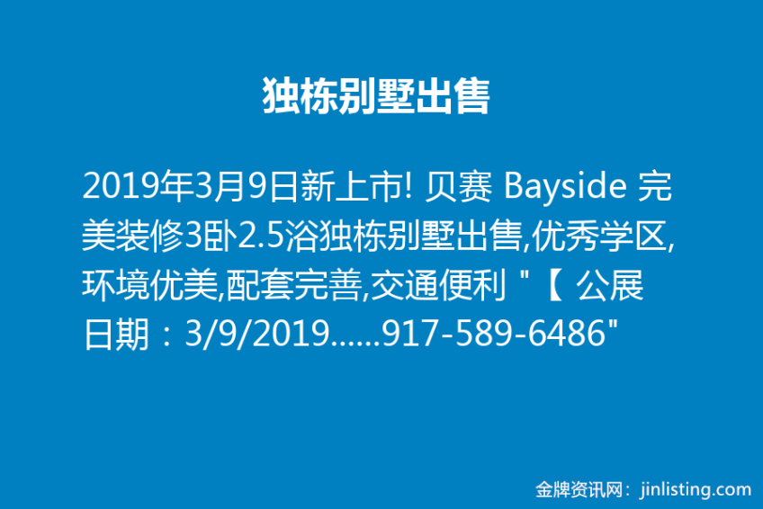 新上市! 贝赛 Bayside 完美装修3卧2.5浴独栋别墅出售,优秀学区,环境优美,配套完善,交通便利 “【 公展日期:3/9/2019 (周六)2pm- 4pm】 房屋是位于纽约是皇后区Bayside的一套独栋别墅。Bayside社区环境优美,配套完善,交通便利,隶属于受到热捧的优秀学区26学区,更被CNN Money评为全美最昂贵的住房市场之一, 因此一直是中高产家庭的置业首选。 这套独栋别墅位于Bayside的中心地带,土地面积6000平方英尺。 房屋为错层式建筑,两层楼加地下室,一层为客厅,厨房,餐厅,餐厅中有一扇门可以直接通往后院,为夏日里在后院举行一些家庭聚会等活动增添便利。 二楼有一间主卧套房自带卫生间,另有两间卧室及一个卫生间。完全装修的地下室拥有可供家人休闲活动空间,半套卫生间,漂亮整洁的洗衣房,以及锅炉房。配设2车库和私人车道。 房子的主人是爱家之人,房子保养做的非常全面,前后院也打理的美观大方,极具观赏价值,除了整齐的灌木和草坪之外,还有一片可供家人休闲聚会的庭院平台。屋内铺设硬木地板,采光明亮,室内燃木壁炉,现代化厨房和不锈钢厨房配套设施,大容量整体橱柜,可以说这是一套基本不需要再做任何装修就可以即可入住的房子。值得一提的是这栋房子的屋顶只有2年新,这也为新屋主省下了不少费用。 1.) 距离几条主要高速公路都不远:LIE,Cross Island Parkway和Northern Blvd。 2.) 公车站有27号巴士直达法拉盛,高速巴士直通曼哈顿。长岛火车LIRR Bayside站。 3.) Bell Blvd上面好吃的餐厅 4.) 近在咫尺的奥克兰湖公园 【 公展日期:3/9/2019 (周六)2pm- 4pm】 地址:222-33 Kenilworth Dr., Bayside, NY 11364 咨询电话:917-589-6486”