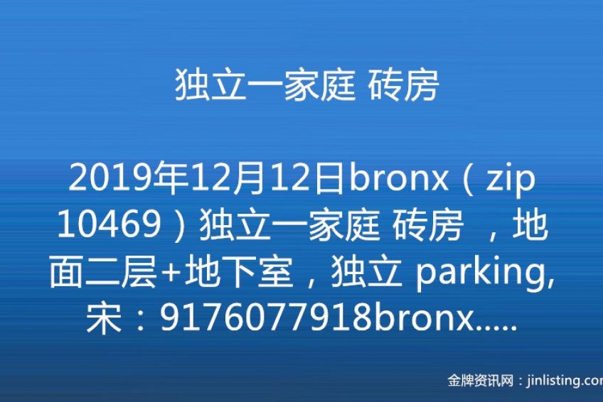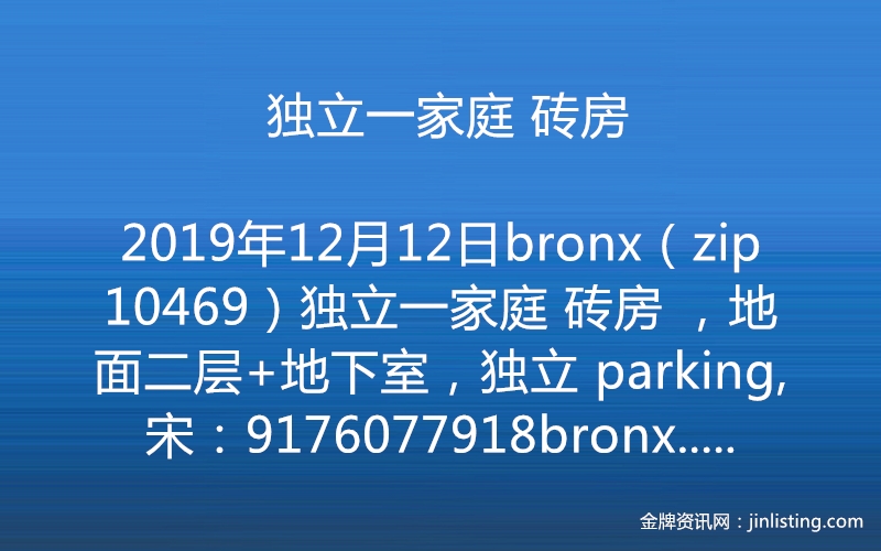 bronx (zip10469)独立一家庭 砖房 ,地面二层+地下室,独立 parking,宋:9176077918 建筑面积1336尺,地税4095,清空.周边同类型房子50万左右,现开价:38.8万
