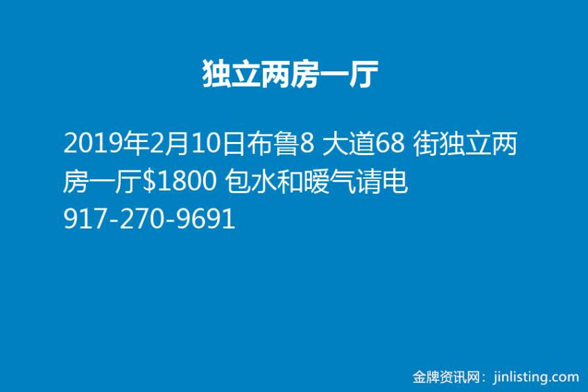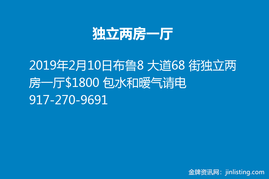 布鲁8 大道68 街独立两房一厅$1800 包水和暧气请电917-270-9691