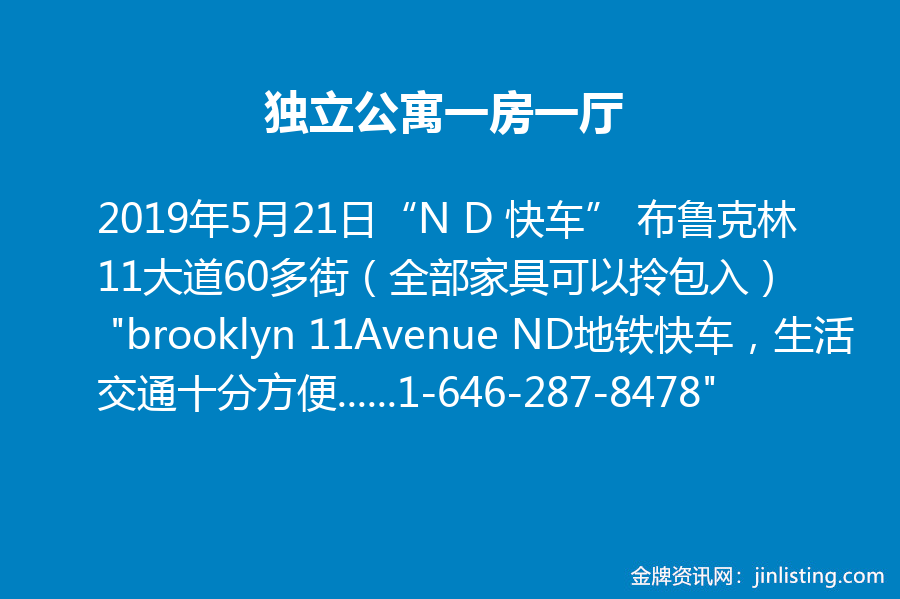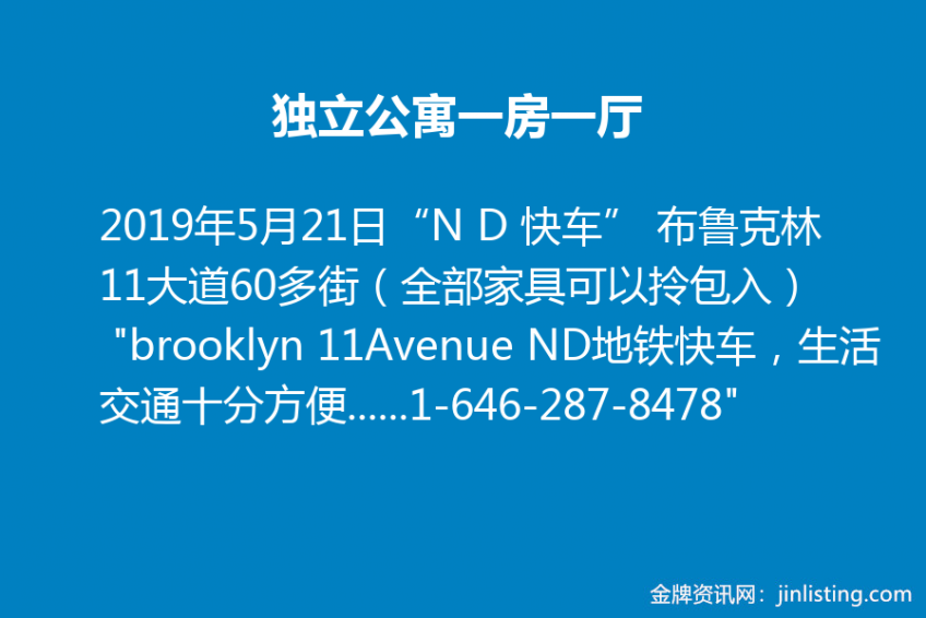 独立公寓一房一厅 “N D 快车” 布鲁克林11大道60多街(全部家具可以拎包入) “brooklyn 11Avenue ND地铁快车,生活交通十分方便 中外超市,餐厅,商店一切方便,步行至中国城 适小家庭,学生,正职人士 勿吸烟宠物, 电话;1-646-287-8478”