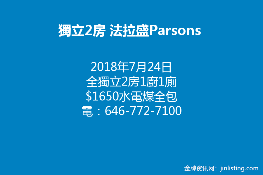 獨立2房 法拉盛Parsons 全獨立2房1廚1廁 $1650水電煤全包 電:646-772-7100