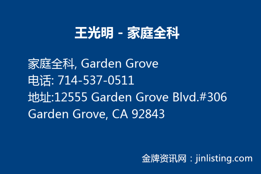 地址: 12555 Garden Grove Blvd., #306 , Garden Grove, CA 92843 电话: 714-537-0511 家庭全科, Garden Grove