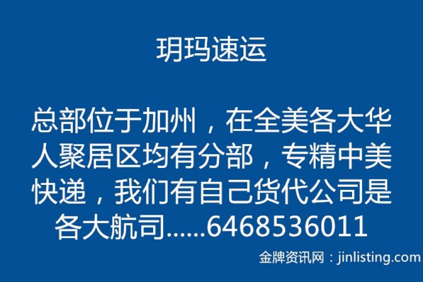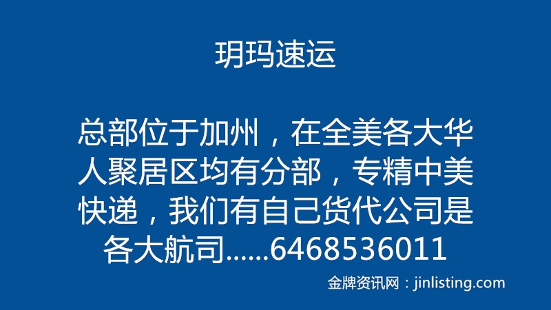 玥玛速运,总部位于加州,在全美各大华人聚居区均有分部,专精中美快递,我们有自己货代公司是各大航司的签约代理,一条龙服务全程货物状态可查。 纽约分部复工承接各大快递代收点,各大代购,海淘的货物,承诺两周内签收。详情可咨询6468536011.或者浏览我们的官网 http://www.yuemaexpress.com/ 玥捷空运,我们是IATA certified的IAC,同时也是国航,东航,南航,海航以及其他各大航空公司的签约代理。我们总部位于洛杉矶,在纽约,旧金山都有分部和自己的仓库,可承接进出口,订舱报关业务。详情可联系6468536011或者email:steven@yuejieair.com.